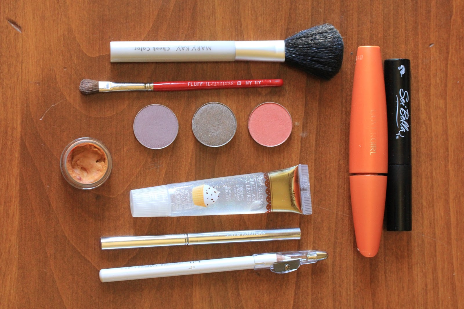 Eyes: Lid: MUG Mango Tango, and Crease: MUG Moondust. Both colors applied with the IL MAKIAGE Fluff NY NY Brush. Mascara: Top Lashes: Cover Girl Lashblast Volume in Brown. Bottom Lashes: Sei Bella Volumizing Mascara in Black/Brown. (This next thing I did is optional if you wan to make your eyes pop a little more: I applied an Elf Shimmer Eye Pencil in Iconic Ivory to the lower lash line. Cheeks: I used the Mary Kay Cheek Color Brush to apply MUG's Unexpected eye shadow to my apples. (I did this just to tone down my naturally very pink cheeks!) :) Lips: I used another color that I made out of crayons, this time a shimmer gold, and topped it with a clear lip gloss. (Applied with my Sonia Kashuk Retractable Lip Brush.